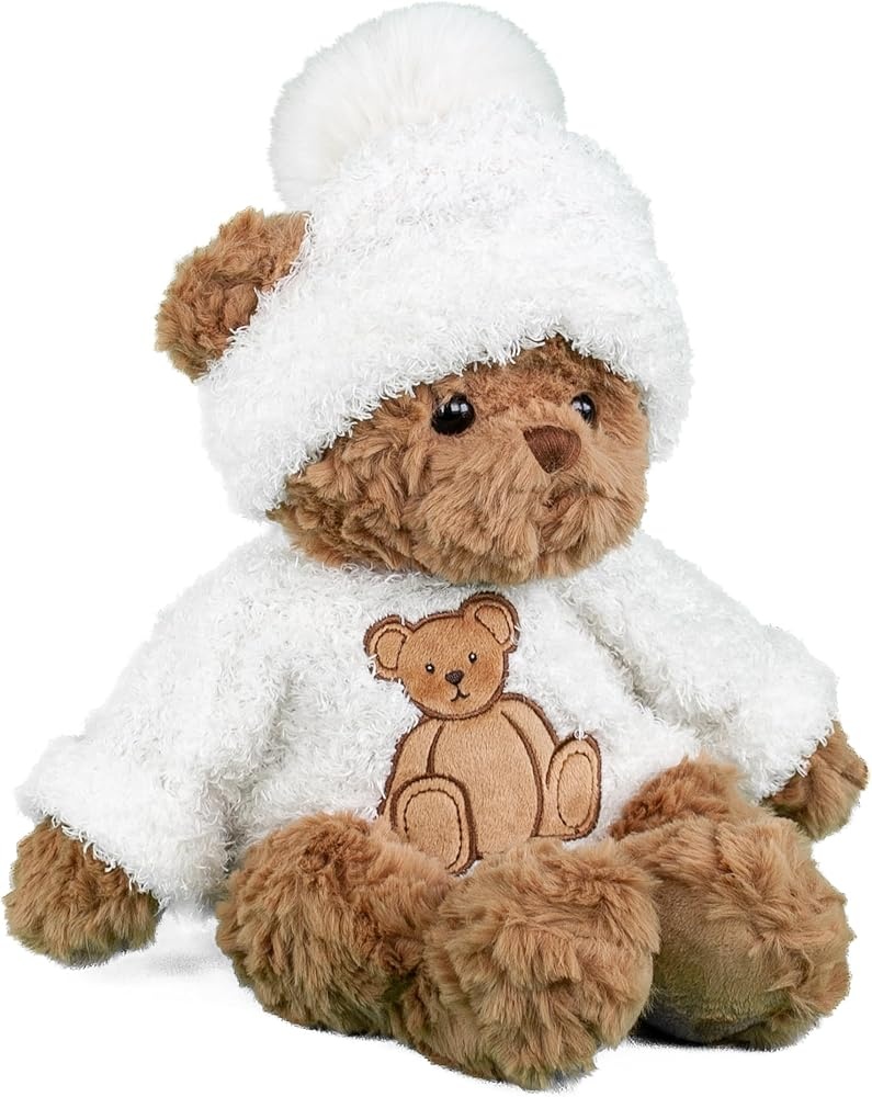 Introducing Hunter, the adorable light brown bear wearing a cozy winter white beanie and a soft white sweater featuring a cute bear design! With his friendly smile and huggable body, Hunter is the perfect companion for chilly days and cozy nights. Ideal for snuggling up during winter adventures or adding a touch of warmth to your holiday decor, this charming bear brings joy and comfort wherever he goes.