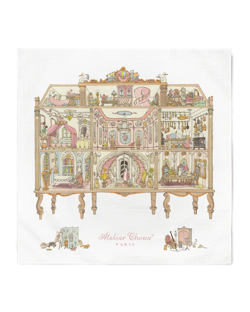 Atelier Choux Carré – Dollhouse is a multifunctional piece for elegant daily use — perfect as a swaddle, lightweight blanket, stroller accent, or decorative photo background.