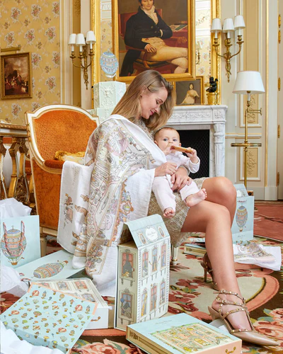 Each design features whimsical illustrations by Mattias Adolfsson, a Swedish artist known for his intricate, imaginative style. This Carré unveils an enchanting miniature manor, where each room invites you into a fantasy of refined playfullness filled with tiny characters and ornate touches, certain to adorn your little ones for any occasion.