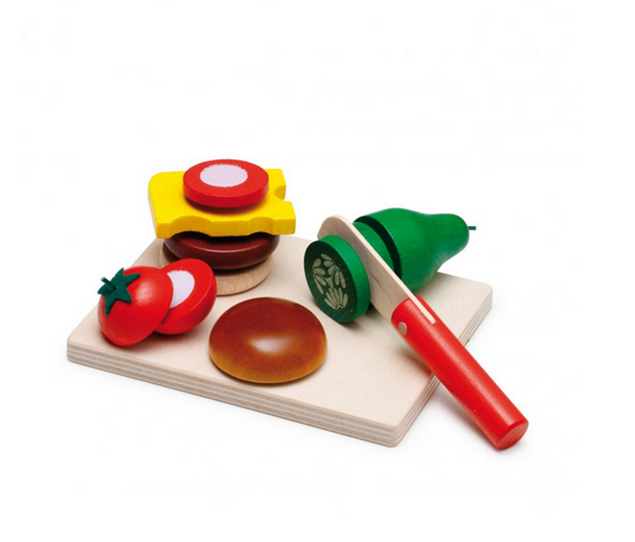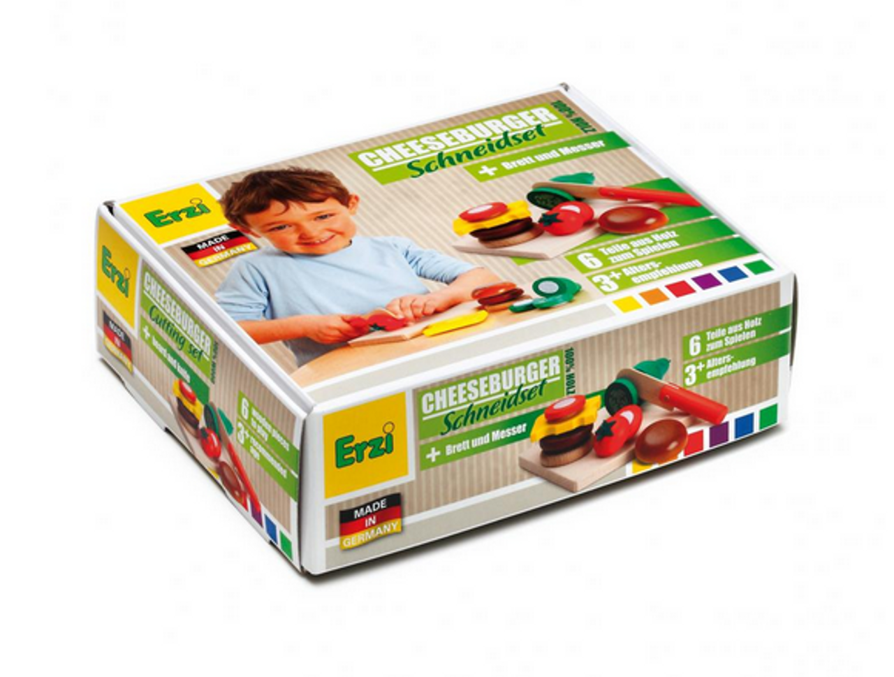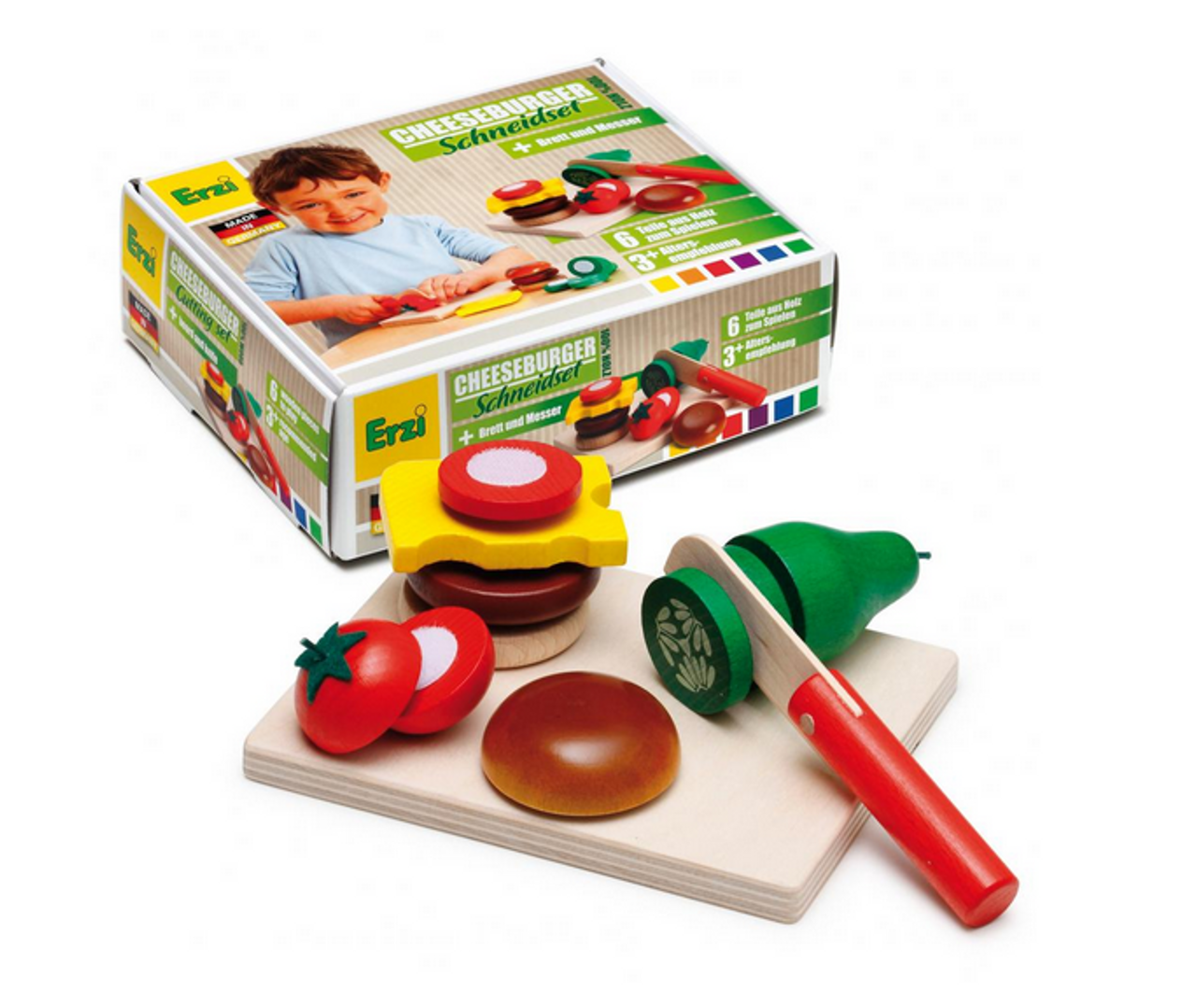 The cheeseburger set includes: 6 wooden pieces - 1 cutting board, 1 knife, 1 portionable hamburger (3 portions), 1 slice of cheese with velcro, 1 portionable tomato (3 portions), 1 portional cucumber (3 portions).