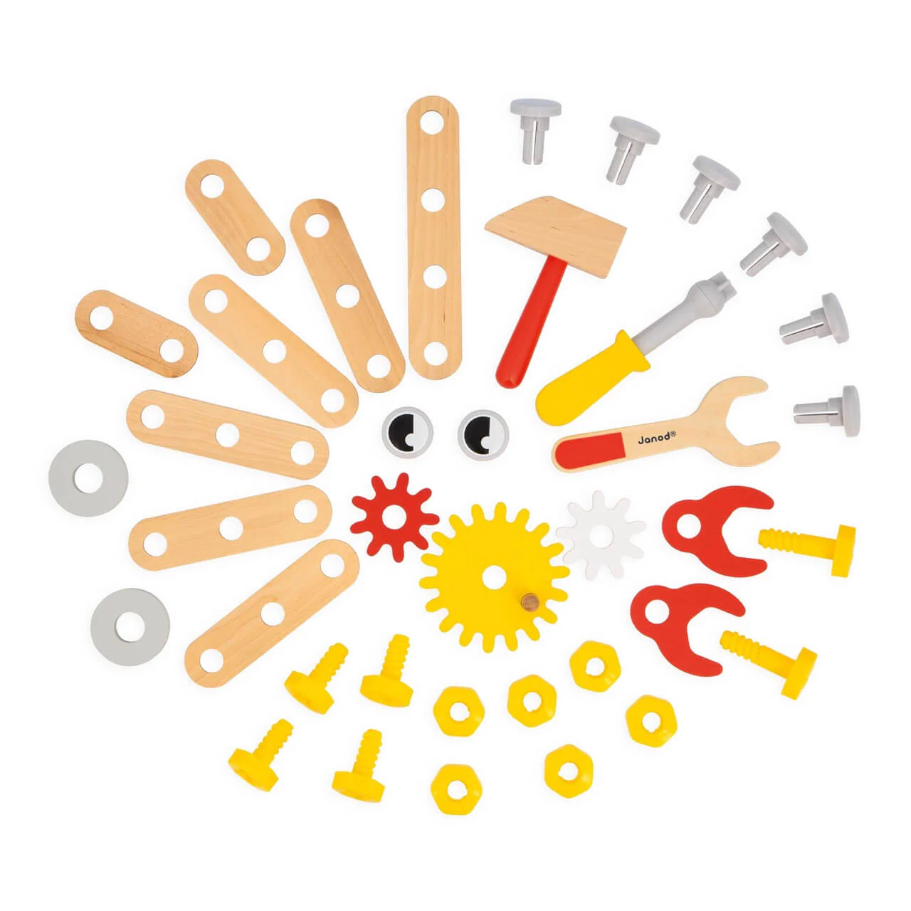 This learning toy is full of surprises: 3 magnetic tools on the front, a vice on the side, and even a storage space in the center! As practical for tinkering as it is for rolling. 38 DIY accessories complete this magnetic baby cart: 18 wooden accessories (inserts and gears), 20 plastic accessories (screws, nuts, nails). Bonus: the screws are notched for added realism.