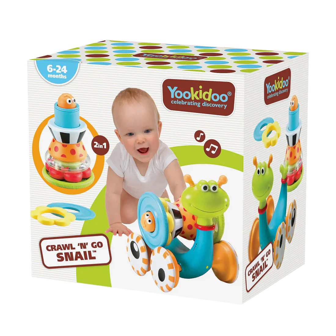 This musical, award-winning, 2-in-1 snail will roll along and get baby excited to crawl after it. Plus that colorful shell on its back doubles as a 7-piece ring stacker. The most adorable snail in town may end up being your baby's best crawling buddy, too.