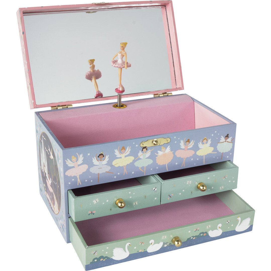 Our musical jewellery boxes are so sweet and are one of our best-selling products! The Enchanted Jewellery Box is covered with gorgeous illustrations of ballerinas, swans and more. The three handy drawers are perfect for storing treasured trinkets. Wind the key up at the back, then lift the lid to see a beautiful ballerina twirl around to the tune of swan lake’.