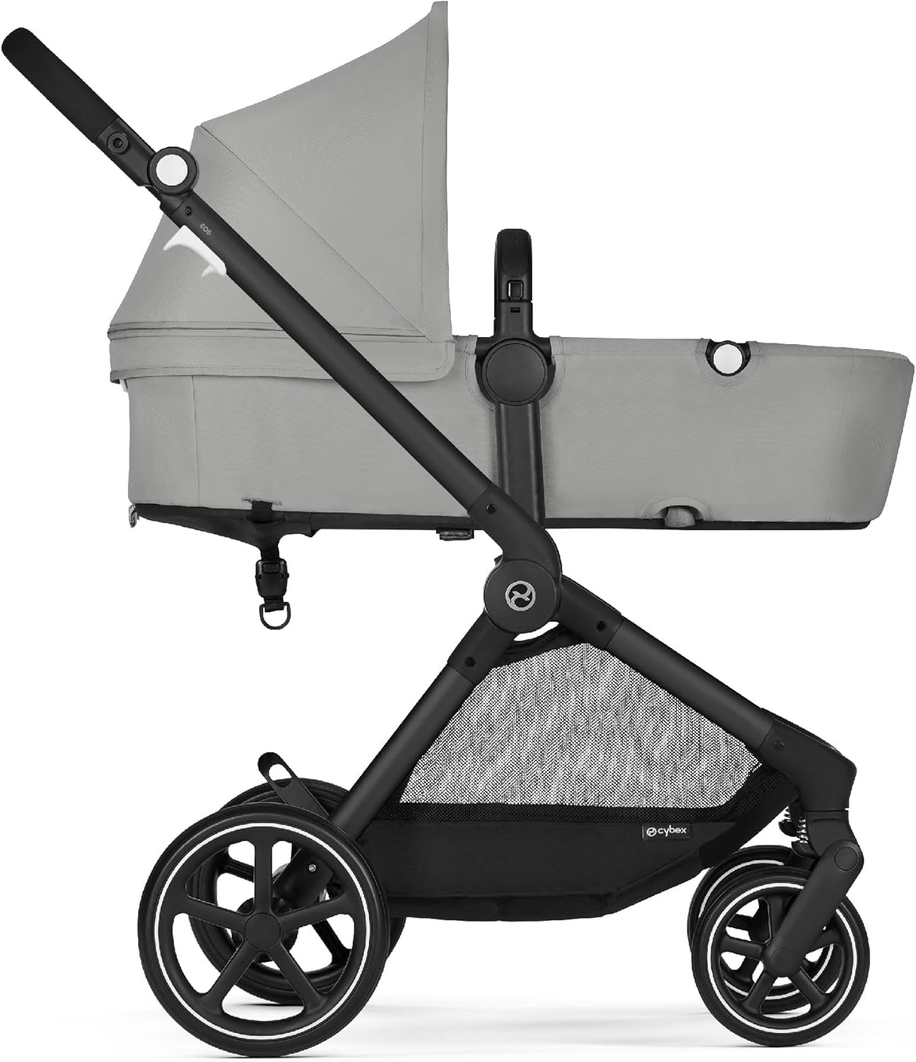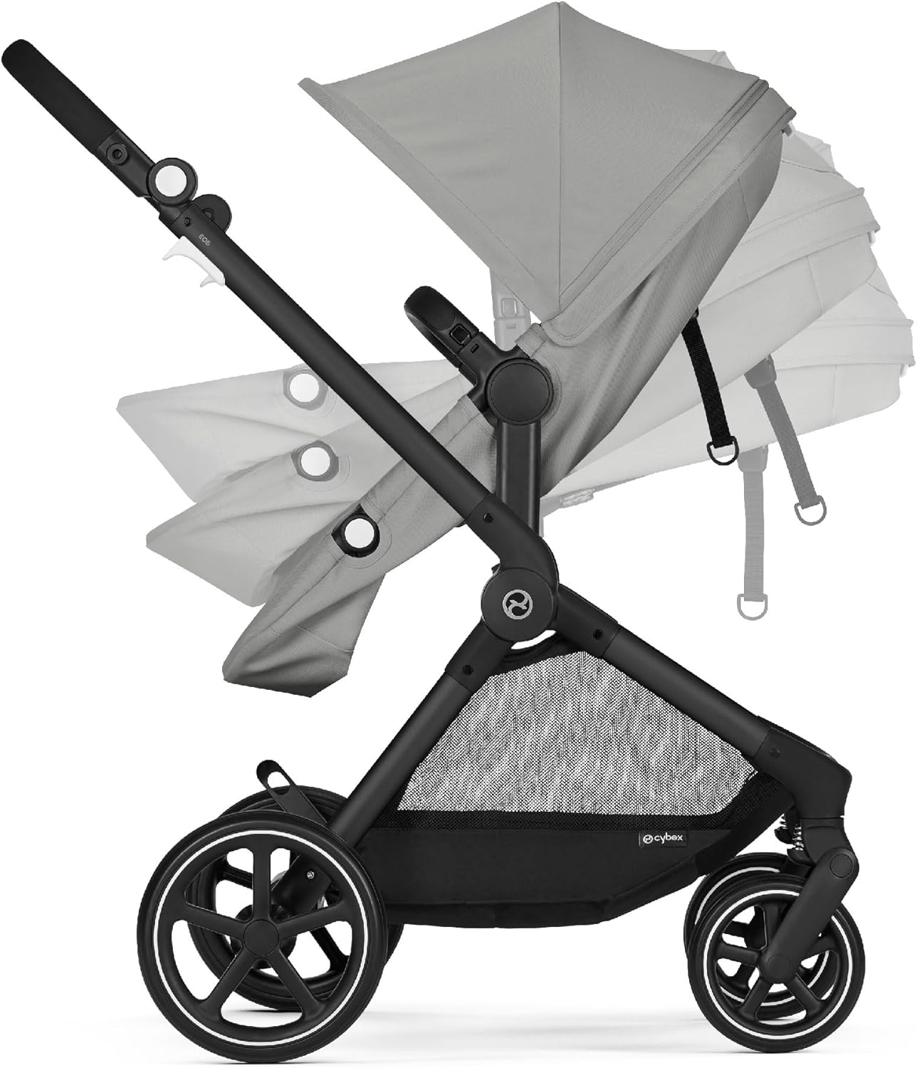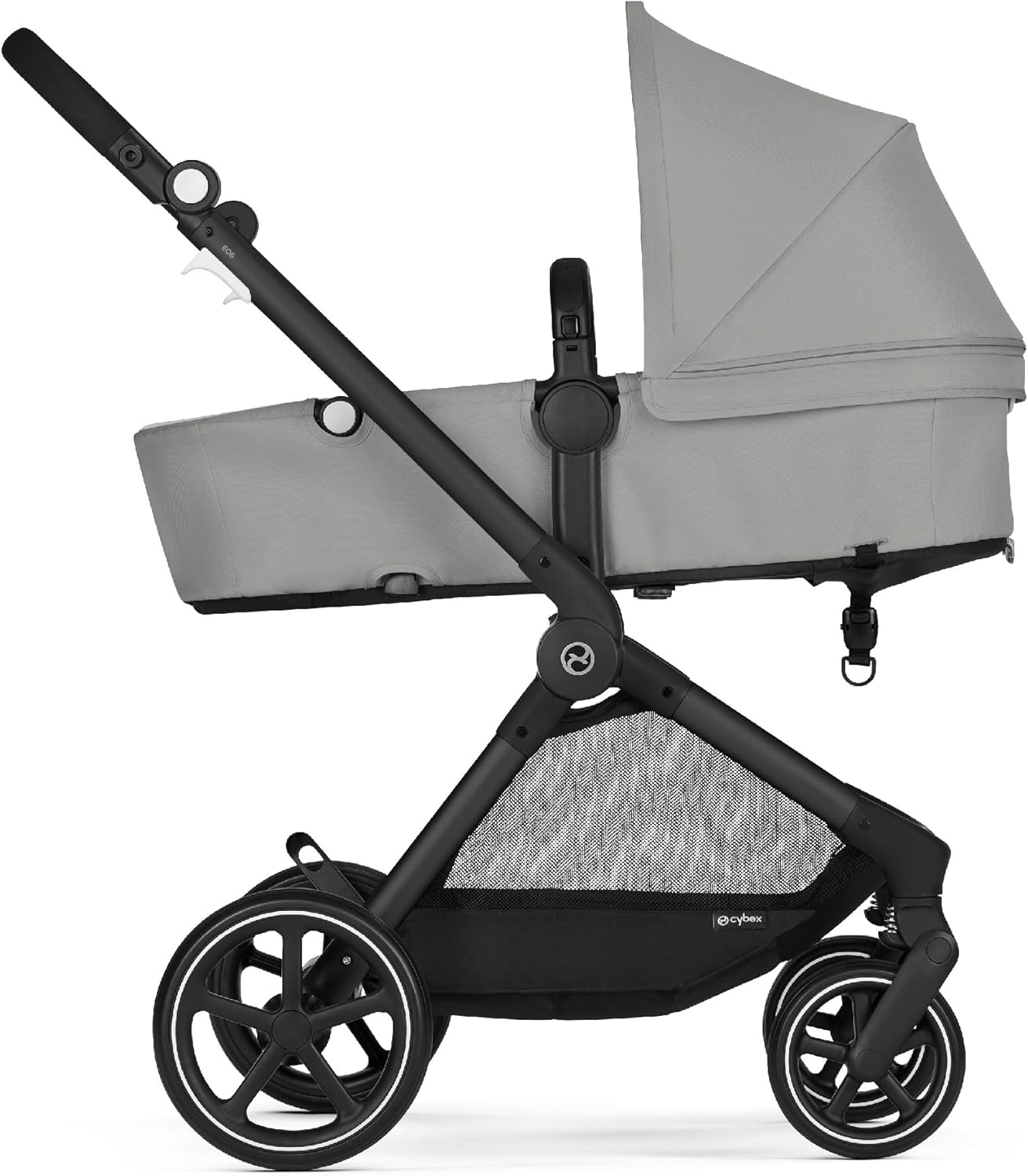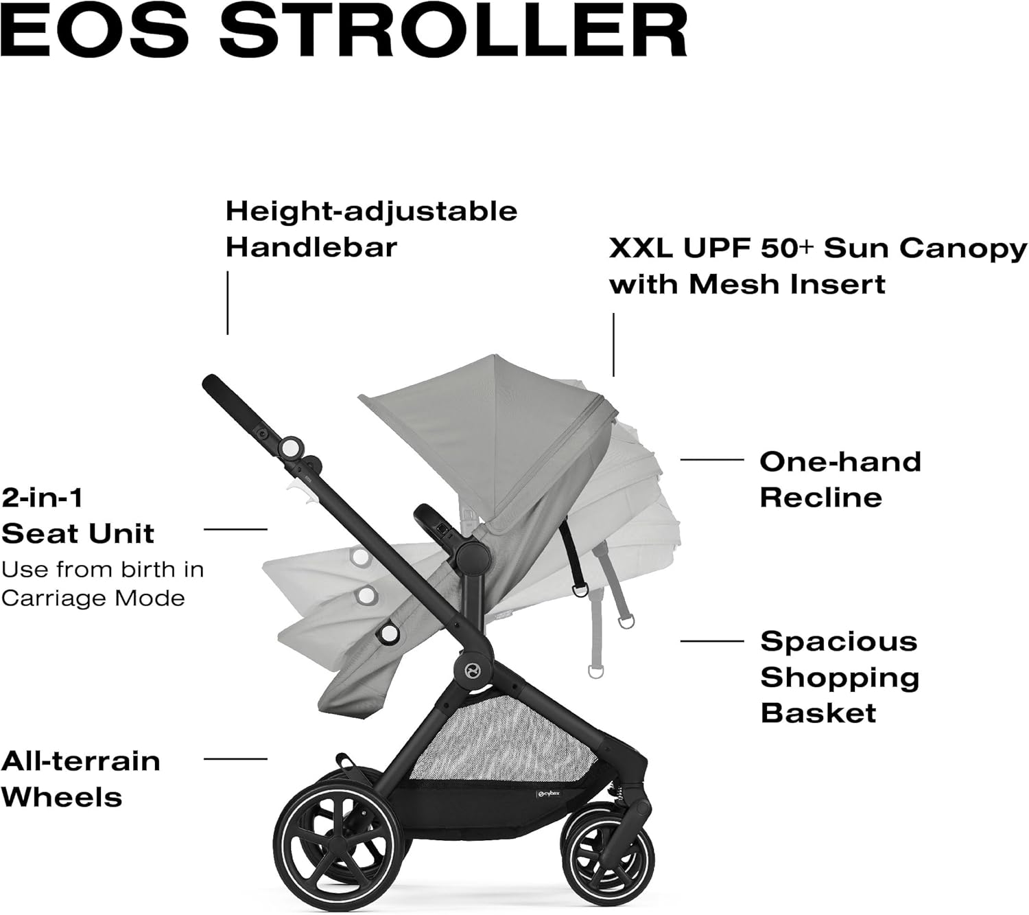 The CYBEX EOS is a perfectly streamlined stroller for your growing family. A complete travel solution from birth, it features a 2-in-1 seat unit that easily converts from lay flat “carriage mode” for your newborn to a reversible toddler seat when your child grows bigger – no extra components or accessories required. Simply attach any CYBEX infant car seat with the included adapters to create the ideal travel system complete with all-terrain wheels, front wheel suspension and an oversized shopping basket. With this versatile frame, the transition from drive to stroll is child’s play!