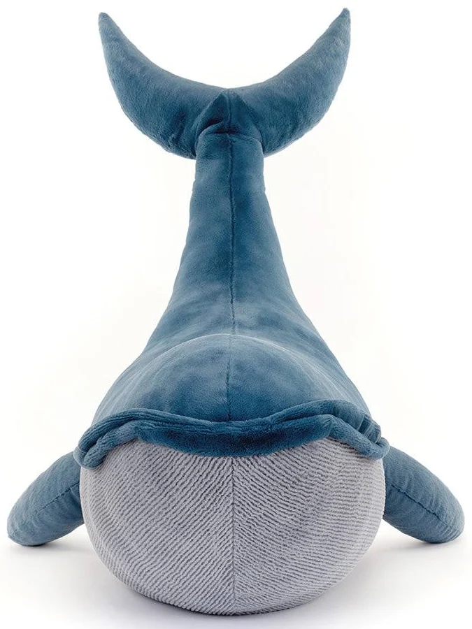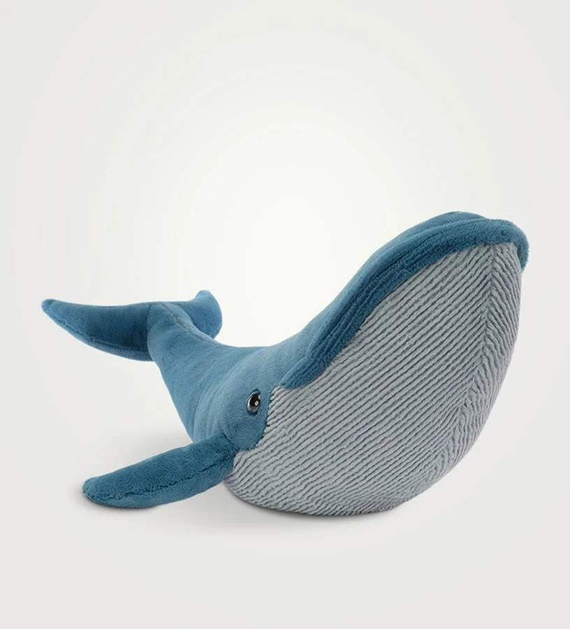 Gilbert the Great Blue is a whale plush with midnight blue fur, chunky fins, and a soft grey underbelly, offering the biggest hugs.