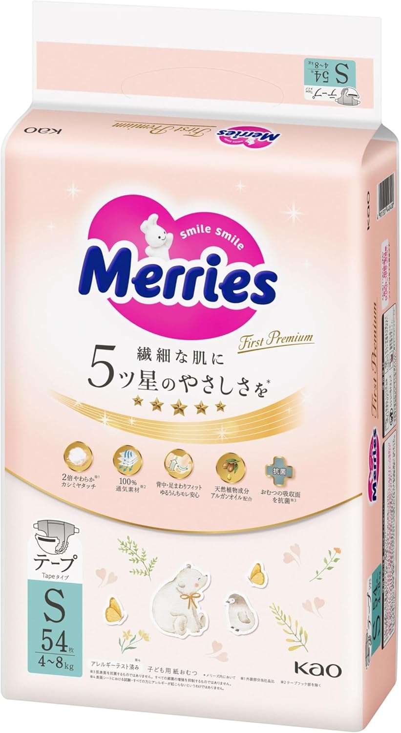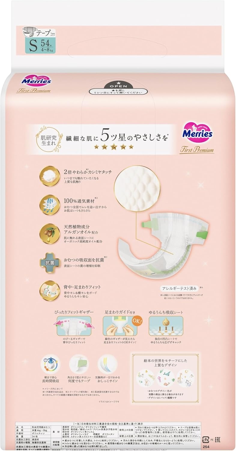 Merries First Premium S diapers-panties are made for baby from 4 to 8kg.