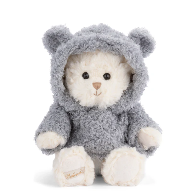 Meet Lucas, a soft-hearted friend wrapped in a cloud‑like grey hoodie with tiny bear ears. His creamy, velvety face and embroidered features give him a sweet, timeless expression — perfect for cuddles, naps, and quiet moments. Lovingly handcrafted with Bukowski’s heirloom-quality plush, Lucas is wonderfully squeezable and built to be a comforting companion for years to come.