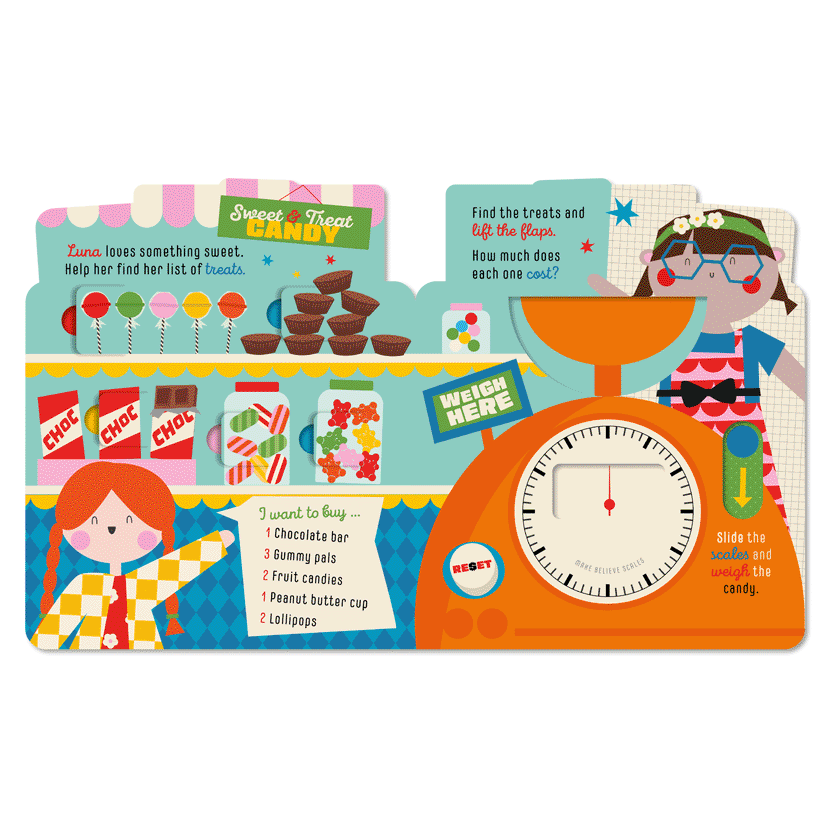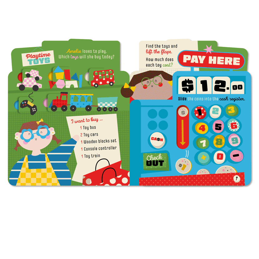 Little ones will love pretending to serve customers as they interact with the flaps and noisy sliders in this cash-register-shaped book. Each store has its own cash register with a fun novelty, including store-themed sounds, a coin slider, and a credit-card-swipe slider.