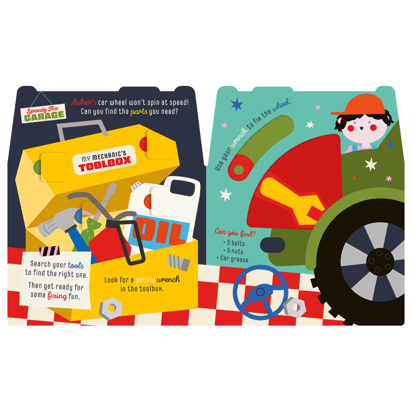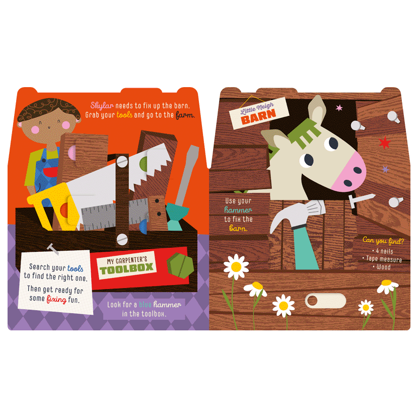 Fix and play with this fun interactive book. Shaped like a toolbox, each spread has a noisy slider and a different thing to fix, including cars, barns, and robots! Each page has fun rhyming text and flaps for kids to explore.
