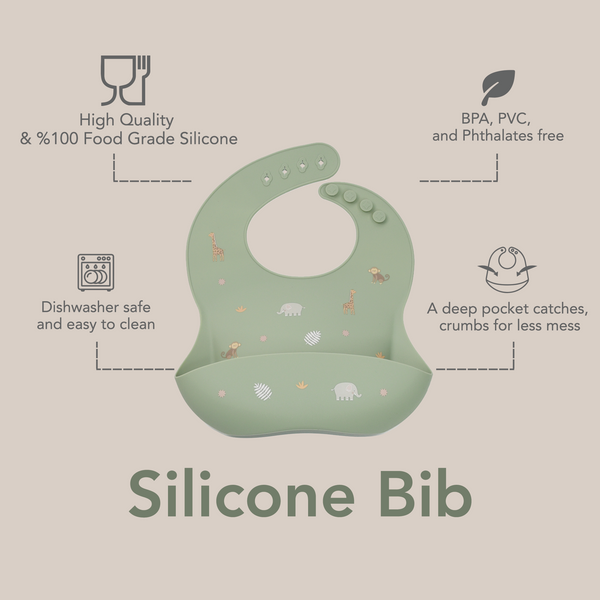 A deep pocket catches crumbs, drips, and drools for less mess. Simply wipe clean after meals or wash in the dishwasher to always have a clean bib on hand. Made from durable, long-lasting food grade silicone, the Silicone Bib is available in an array of calming, modern colors and prints for your little one.