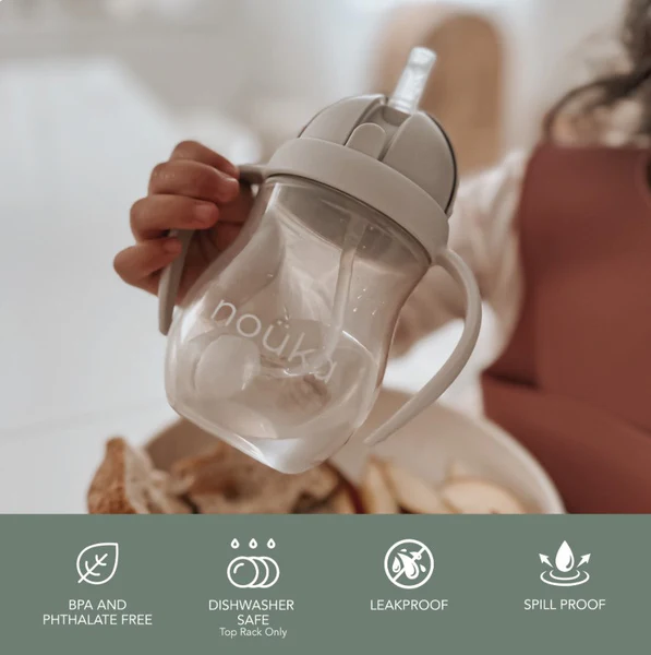 This cup features a flexible straw, equipped with a weighted ball, providing a seamless sipping experience for both babies and toddlers. The silicone leakproof straw tip prevents spills, while the weighted straw ensures liquids are accessible from any angle, even when the cup is upside down.