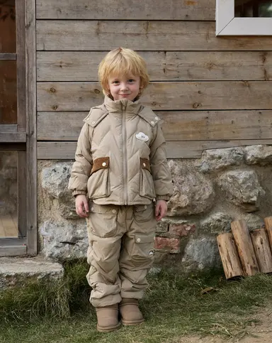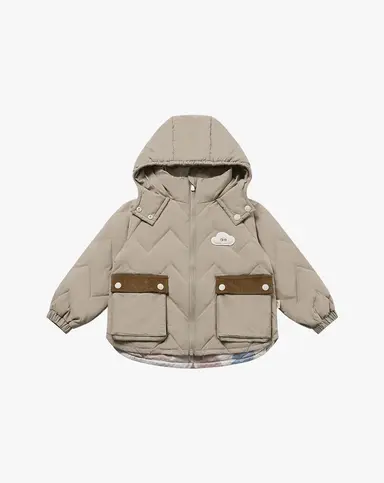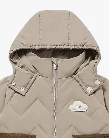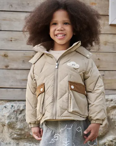 A quilted jacket that feels like being hugged by clouds—pillowy soft with a cozy hood, corduroy accents, and a sweet little cloud detail.