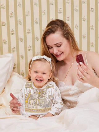 Reversible and adorned with original illustrations on both sides, the Atelier Choux bib blends practicality with artistic charm. The bib is adjustable and features branded golden snaps. Recommended from birth to 24 months.