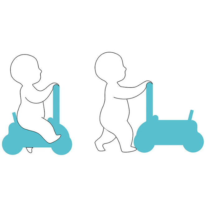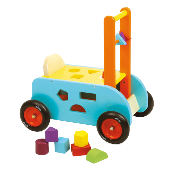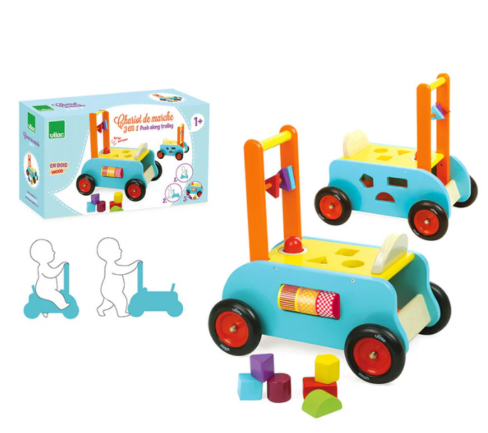 Here's a walking companion that doesn't do things by halves: this super clever wooden wagon combines three functions in one toy! First, it serves as a push walker to support baby's first steps, then it becomes a ride-on toy or walker to transport toys or treasures, and finally, it transforms into a multi-activity table where manipulating, stacking, sorting… anything goes for fun. With it, children discover how to walk, think, and play, all in one toy.