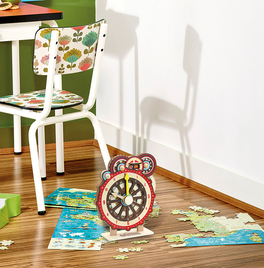 Tick ??tock, tick tock, goes the sound of the hands on this magnificent wooden learning clock. Fall for its steampunk look, and its fun cards to learn to tell the time and find your way around time.