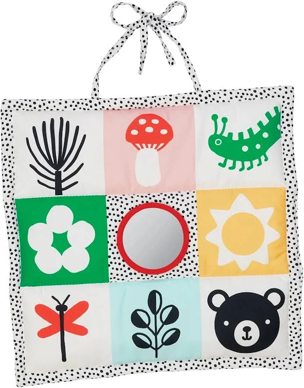 So much more than a play mat! Offers 3 ways to play whether baby’s enjoying tummy-time, seated play or traveling in the car. This 3-in-1 reversible playmat features black-and-white high-contrast graphics on one side and introduces bright colors to support baby’s natural visual progression. Other stand-out features include a baby-safe mirror, a variety of fabric textures and a tethered-on silicone teether that tucks inside a peek-a-boo pocket.